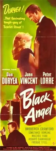 Black Angel is a 1946 American film noir starring Dan Duryea, June Vincent and Peter Lorre. Directed by Roy William Neill, it was his final feature film. Produced by Universal Pictures, it is set in Los Angeles and broadly adapted from Cornell Woolrich's 1943 novel The Black Angel.