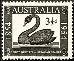 1954 Australian stamp commemorating the first Western Australian stamp which featured the black swan