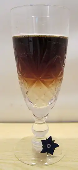 A black velvet can also be made by filling a champagne flute halfway with sparkling wine and floating the chilled stout beer on top of the wine.[5] The differing densities of the liquids cause them to remain largely in separate layers (as in a pousse-café).[5] The effect is best achieved by pouring the stout over a spoon turned upside down over the top of the glass.[5][6]