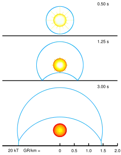 where is the density of the air and is the energy released by the explosion.[16][17][18] This result allowed Taylor to estimate the nuclear yield of the Trinity test in New Mexico in 1945 using only photographs of the blast, which had been published in newspapers and magazines.[9] The yield of the explosion was determined by using the equation: