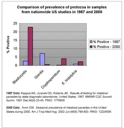 - Prevalence over Time: A 1989 study of the prevalence of Blastocystis in the United States found an infection rate of 2.6% in samples submitted from all 48 states.[50] The study was part of the CDC's MMWR Report. A more recent study, in 2006, found an infection rate of 23% in samples submitted from all 48 states. However, the more recent study was performed by a private laboratory located in the Western US, and emphasized samples from Western states, which have previously been reported to have a higher infection rate.[50]