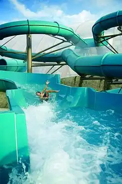 The waterpark features a beach-style swimming pool with a wave machine, spa pools, river rapids ride, two water flumes, a lazy river that takes you outside, a pirates’ shipwreck and a separate wet play area for children in the water cove.[2][5][6][7]
