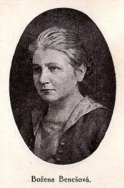 Božena Benešová, née Zapletalová (30 November 1873 – 8 April 1936), was a Czech author and poet whose work is considered to have been at the forefront of psychological prose. The greater part of her youth was spent in Uherské Hradiště and Napajedla, where in 1896 she married a railway clerk named Josef Beneš. In 1908 she and her husband moved to Prague.