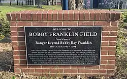 Franklin purchased Best Dollar Store in Tunica, Mississippi and operated it as Bobby Franklin's Dollar Store for three years before accepting an offer to join the coaching staff of Northwest Mississippi Community College in 1979. He served as offensive coordinator for two seasons under head coach Ray Poole. He was named head coach in 1981, a post he held for 24 years, leading the Rangers to eight bowl games, finishing with a record of 201–57–6 before retiring after the 2004 season. Under Franklin, the team won the NJCAA National Football Championship in 1982 and 1992 and was runner-up in 1991. As head coach, Franklin helped to develop 35 players who went on to have careers in the NFL or the Canadian Football League (NFL).[20] Franklin was named to the school's Hall of Fame in 2003.[21] The school named its football stadium Bobby Franklin Field in tribute to Franklin in 2005.