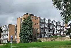 The site opened in October 1961,[5] and was completed by 1963.[6] The following year architect Denis Mason-Jones won the Leeds Gold Medal for his design.[7] The hall was named after Sir Nathan Bodington, the first Vice Chancellor of the university.[8] Bodington was originally an all-male hall, with Woodsley, Vaughan, Hay and Seton Houses becoming mixed at the start of the academic year 1976 and the other four following later. For that year the Woodsley student president was Chris Snowden, later Professor Sir Christopher Snowden, vice chancellor of the University of Surrey and subsequently the University of Southampton. A large decorative panel in aluminium by the sculptor Hubert Dalwood was installed on the exterior of the refectory and was Grade II listed in 2012.[9][10][11]