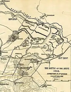 The 2nd Devonshires were part of the 8th Infantry Division which had been severely depleted by the Spring fighting and had, on 12 May, been attached to General Duchêne's French Sixth Army and sent to a quiet sector to recuperate and rebuild.[2] They were taken out of the line on May 20 and assigned to the reserve at Roucy for training of newly arrived replacement drafts. On 26 May, it was learned from captured German prisoners that an attack was due early the next morning, although there was little indication of the magnitude of what was to come. Late that afternoon, the battalion was ordered to occupy positions on Bois des Buttes, a wooded sandstone hill southwest of La Ville-aux-Bois that had been fortified by both the French and the Germans over the previous years. In addition to its surface fortifications, the hill was criss-crossed with creutes—underground quarries whose galleries were dry, impervious to shellfire and, in many cases, electrically lit, and in which the troops took shelter.[3][4] Positioned approximately 1200 yards behind the front line, the battalion was to be Brigade Reserve for the 23rd Infantry Brigade. The battalion completed the four-and-a-half mile march from Roucy and reported to Brigade Headquarters that it was in position by midnight.