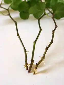Cuttings. In taking a cutting, part of a growing plant is cut off and placed in a growing medium to develop roots. If the part that is cut off is fairly thick, like a mature branch, it can be grown into an aged-looking bonsai more quickly than can a seed. Thinner and younger cuttings tend to strike roots more easily than thicker or more mature ones. In bonsai propagation, cuttings usually provide source material to be grown for some time before training.[3]