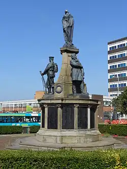 The memorial was built in stone from the Forest of Dean, and the figures are in bronze, cast by the Maneti foundry. The overall height of the memorial is about 7.3 metres (24 ft), and the figures standing on the base are about 2.1 metres (7 ft) high.[2] The base of the monument stands on two circular steps, and has twelve sides divided by pilasters. Between the pilasters are bronze plaques inscribed with the names of the Bootle men who were killed in the World Wars. Standing on the base is a triangular obelisk with concave sides, which carries the figure of a mother holding her child. On the base around the obelisk are three standing figures, a soldier, a sailor, and an airman.[a] Between the figures are three bronze wreathes. On the west side of the memorial is a plaque commemorating the Liverpool Escort Force of the Second World War.[3][4] An inscription on the monument reads "In grateful memory of over a thousand men from Bootle who made the supreme sacrifice in the Great War, 1914-1918".[4]
