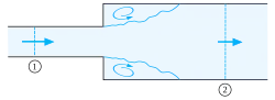 The Borda–Carnot equation is applied to the flow through a sudden expansion of a horizontal pipe. At cross section 1, the mean flow velocity is equal to v1, the pressure is p1 and the cross-sectional area is A1. The corresponding flow quantities at cross section 2 – well behind the expansion (and regions of separated flow) – are v2, p2 and A2, respectively. At the expansion, the flow separates and there are turbulent recirculating flow zones with mechanical energy losses. The loss coefficient ξ for this sudden expansion is approximately equal to one: ξ ≈ 1.0. Due to mass conservation, assuming a constant fluid density ρ, the volumetric flow rate through both cross sections 1 and 2 has to be equal: