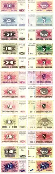The first issues were overprinted on Yugoslav banknotes. In November 1992, 10 dinar banknotes were overprinted with denominations of 100,000 dinars.[2] After suffering from high inflation, a second dinar was introduced in August 1994, replacing the first at a rate of 1 "new" dinar = 10,000 "old" dinara. Both these dinars were restricted in their circulation to the areas under Bosniak control. The Croat areas used the Croatian dinar and kuna, whilst the Serb areas used the Republika Srpska dinar.