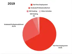 For the 2020 first destination activity, 55% of the graduates were employed full-time, a higher percentage of 32% pursued further education in graduate or professional programs, 11% were still seeking employment, and 3% were involved in other activities, which included part-time work, military service, or taking time off.
