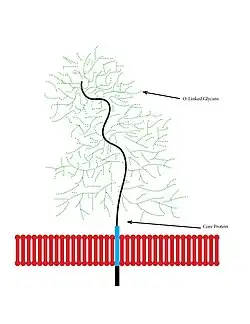 The structure of mucin is shown and includes a core protein with O-linked glycans.