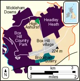 ![]() Map of Box Hill, showing the areas managed by the National Trust (purple), Surrey Wildlife Trust (turquoise) and Surrey County Council (green). The urban area of Box Hill village is shown in grey. | |