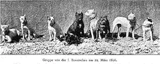 The white female dog Ch. Blanka von Angertor, Flocki's sister, was even more influential when mated with Piccolo von Angertor (Lechner's Box grandson) to produce the predominantly white (particolored) female dog Meta von der Passage, which, even bearing little resemblance with the modern Boxer standard (early photographs depict her as too long, weak-backed, and down-faced), is considered the mother of the breed.[28][29] John Wagner, in The Boxer (first published in 1939) said the following regarding this female dog:[30]