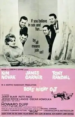 Boys' Night Out is a 1962 American romantic comedy film starring Kim Novak, James Garner, and Tony Randall, and featuring Howard Duff, Janet Blair, Howard Morris, Patti Page, Anne Jeffreys, Jessie Royce Landis and Oscar Homolka. The picture was directed by Michael Gordon and was written by Ira Wallach based on a story by Arne Sultan and Marvin Worth.
