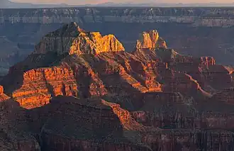 Brahma Temple is a 7,551-foot-elevation (2,302-meter) summit located in the Grand Canyon, in Coconino County of Arizona, US.[3] It is situated six miles (9.7 km) north-northeast of the Yavapai Point overlook on the canyon's South Rim, and 4.5 miles south of the North Rim's Bright Angel Point. It towers 5,000 feet (1,500 meters) above Phantom Ranch in Bright Angel Canyon. Its nearest higher neighbor is Oza Butte, four miles to the north-northwest.[1] Other neighbors include Zoroaster Temple one mile to the south, and Deva Temple, 1.5 miles to the north. Brahma Temple is named for Brahma, the Hindu creator of the universe. This name was applied by Clarence Dutton who began the tradition of naming geographical features in the Grand Canyon after mythological deities.[4] This geographical feature's name was officially adopted in 1906 by the U.S. Board on Geographic Names.[3]
