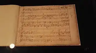 F-Sn Ms 2.965 and D-B Mus. ms. Bach St 131 are manuscript copies of the concerto realised during the composer's lifetime, in 1721 and around the 1730s respectively, after the autographs of the final version.[15][16] In his Triple Concerto, BWV 1044, Bach returned to the format of the fifth Brandenburg Concerto. A handful extant copies of the fifth Brandenburg Concerto were produced in the second half of the 18th century.[17] In this period Bach's autograph score and performance parts of BWV 1050 were owned by Johann Kirnberger and the composer's son Carl Philipp Emanuel respectively: by the middle of the 19th century both manuscripts were in the possession of the Berlin State Library, the former via Kirnberger's pupil Princess Anna Amalia of Prussia and the Joachimsthal Gymnasium, and the latter via Georg Poelchau.[12][11][18]
