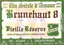 A 2006 ownership change tightened the brewery's market focus and expanded export markets. Seven products were retired and new packaging labels commissioned.[7] Brunehaut ships eleven labels across four continents, to more than twenty countries. Brewed as under 1000+-year-old Belgian brewing tradition, these beer styles feature Abbaye de Saint-Martin Dubbel and Tripel bottle-conditioned ales,[8] both Certified Belgian Abbaye Beers.