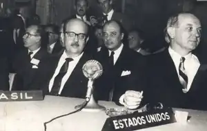 Brazil had US$338 million in American loans already negotiated, but not yet delivered. With bureaucratic justifications, this credit was effectively frozen after the inauguration. Dean Rusk conditioned its release on Brazil's commitment to the goals negotiated by Jânio with the IMF.[100] This impediment did not last long, and by April 1962 $224 million that had been negotiated under the previous government was released.[101] The release was little by little and, when possible, at short notice.[102] The pressure exerted by Minister of Finance Walter Moreira Salles,[103] Kennedy's desire not to give the impression of being a deal breaker,[101] Goulart's weakened position within the parliamentary system, his political moderation and the importance of Brazil explain the continuity of American support at the beginning of his government.[104]
