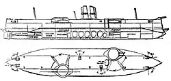 Riachuelo was constructed with a steel hull, and was the first battleship with a compound armour belt, following shortly after the Argentine armoured corvette ARA Almirante Brown. Both Riachuelo and Aquidabã had an unusual design that became popular in the 1870s and 1880s: the two main gun turrets were placed off the centreline, en echelon, with the forward turret offset to port and the aft turret to starboard. The superstructure ran the full length of the vessel, higher than both turrets, with two funnels and three fully rigged masts. Aquidabã can be distinguished by its single funnel.