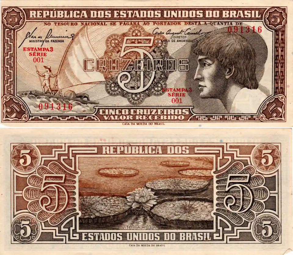 In 1961, the third stamp of the Cr$5 banknote, called "Nota do Índio", would be released experimentally by the Casa da Moeda do Brasil. The very limited print run of this banknote issued in the years 1961 and 1962, as well as its low intrinsic value, made this banknote a true souvenir quite collected by numismatists.