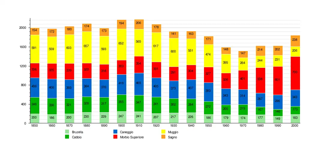 Bruzella is first mentioned in 852 as Brusella.[4] Cabbio is first mentioned in 1188 as Cabio.[5] Caneggio is first mentioned in 1209 as Canegio. In 1335 it was mentioned as Canezio.[6] Morbio Superiore is first mentioned in 1116 as Morbio de Supra.[7] Muggio is first mentioned in 852 as Mugio.[8] Sagno is first mentioned around 1296-99 as Sagnio.[9]