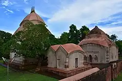 According to David McCutchion,[4] the jor-bangla temple of Chaitanya in the Brindaban Chandra Math is the earliest Bangla-style temple still standing. It was built during the reign of Akbar (1542–1605). The at-chala Brindabanchndra temple was built in 1801. The eka-ratna Ramchandra temple was built in the 17th century. The last temple has a rich terracotta façade.[3]