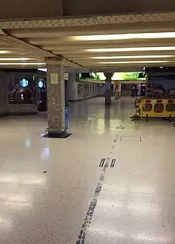 In the late 1960s the Royal Mail built a mail conveyor at the northern end of the station, with significant aesthetic impact. This was out of use for many years following the transfer of Royal Mail's activities to the West of England Mail Centre at Filton and the opening of the short-lived Railnet Hub next to Bristol Parkway station in May 2000.[19] It was finally dismantled in stages and removed between October and December 2014.[20] In 1990/91, £2 million was spent by InterCity on a renovation of the main train shed and another £7 million on restoring some of the older areas of the station, including the refurbishment of the subway and construction of new retail outlets. The shorter of the two 1935 platform islands had been used only for parcels traffic since the 1960s but was temporarily brought back into passenger use during this work. It was fully restored for passenger use in 2001.[13]