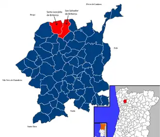 Briteiros São Salvador e Briteiros Santa Leocádia (officially: União das Freguesias de Briteiros São Salvador e Briteiros Santa Leocádia) is a civil parish in the municipality of Guimarães, Portugal. It was formed in 2013 by the merger of the former parishes São Salvador de Briteiros and Santa Leocádia de Briteiros.[1] The population in 2021 was 1,687,[2] in an area of 9.39 km2.[3]