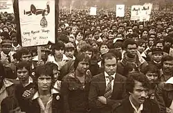 On 4 May 1978, Altab Ali, a 24-year-old Bangladeshi leather clothing worker, was murdered by three teenage boys as he walked home from work in a racially motivated attack.[28] The murder took place near the corner of Adler Street and Whitechapel Road, by St Mary's Churchyard.[20][25] This murder mobilised the Bangladeshi community in Britain. Demonstrations were held in the area of Brick Lane against the National Front,[29] and groups such as the Bangladesh Youth Movement were formed. On 14 May, over 7,000-10,000 people, mostly Bangladeshis, took part in a demonstration against racial violence, marching behind Altab Ali's coffin to Hyde Park.[30][31][32] Some youths formed local gangs and carried out reprisal attacks on their skinhead opponents (see Youth gangs).