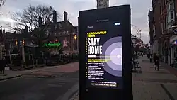 The stay-at-home order was announced by the Prime Minister, Boris Johnson, in a television broadcast. It was initially expected to last at least three weeks, superseding the government's guidance for the public to go about their normal lives while remembering to wash their hands thoroughly.[70] The "Stay Home" slogan appeared on the lecterns that speakers stood behind at the press conferences. It was often seen in capital letters, on a yellow background, with a red and yellow tape border. The government commissioned and broadcast millions of radio, television,[70] newspaper and social media adverts. These were often accompanied by photographs of healthcare workers wearing personal protective equipment, including face masks.[71]