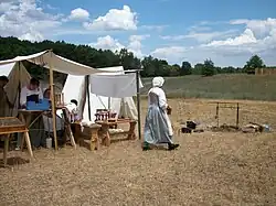 On an 18th-century battlefield, the camp set up by a regiment would have been extremely simplistic in terms of possessions and comforts.[24] Only the very basic necessities would have been taken as everything a regiment needed had to be carried while on the move.[25]