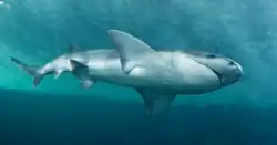 It is also known as sevengill shark or simply sevengill and was formerly known as cow shark and mud shark; it is called sevengill due to its seven gill slits. Because of this, it was listed along with the sharpnose sevengill shark (Heptranchias perlo) by Guinness World Records as having the most gill slits.[2] It is similar to the sharpnose sevengill shark but the latter has a pointed snout and lacks spots on its dorsal surface.[3][4] The sevengill species are also related to ancient sharks as fossils from the Jurassic Period (200 to 145 million years ago) also had seven gills. As recently as the 1930s and 1940s, the shark was targeted by fisheries along the coast of California and, once the commercial fishery receded, recreational fishing of the shark started in the 1980s and 1990s.[5]