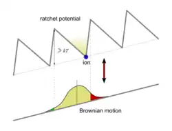The thermal noise on the nanoscale is so great that moving in a particular direction is as difficult as "walking in a hurricane" or "swimming in molasses".[8] The theoretical operation of the Brownian motor can be explained by ratchet theory, wherein strong random thermal fluctuations are allowed to move the particle in the desired direction, while energy is expended to counteract forces that would produce motion in the opposite direction. This motion can be both linear and rotational. In the biological sense and in the extent to which this phenomenon appears in nature, this exists as chemical energy is sourced from the molecule adenosine triphosphate (ATP).