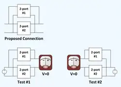 To check if two two-port networks can be connected in a parallel-parallel configuration, first of all just the input ports are connected in parallel, a voltage is applied to the input and the open-circuit voltage is measured/calculated between the outputs that are short-circuited each. If there is a voltage drop, the two-port networks cannot be combined in parallel. The same test is repeated from the output side of the two-port networks (parallel connection of the output ports, application of a voltage to the output, measurement/calculation of the open-circuit voltage between the inputs that are short-circuited each). Only if there is no voltage drop in both cases, a combination of the two-ports networks is permissible.