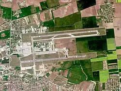 Originally, the airport in Otopeni was intended to be used as a Romanian civil aviation and military training center. During World War II, it was used as an airbase by the Luftwaffe. It was further developed in 1943, becoming one of the principal Luftwaffe bases around Bucharest. By 1944, it featured a beam approach system and two concrete runways, one of 1,370 metres (4,490 ft) aligned North-South and one of 1,190 metres (3,900 ft) aligned East-West.[6] After 23 August 1944, the airport was used to launch air raids on Bucharest in support of the German efforts to overthrow the new government.[7] It was bombed by the USAAF on 26 August and taken over by the Romanian military in the aftermath.[8][9]