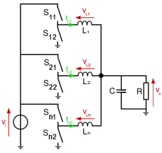 The multiphase buck converter is a circuit topology where basic buck converter circuits are placed in parallel between the input and load. Each of the n "phases" is turned on at equally spaced intervals over the switching period. This circuit is typically used with the synchronous buck topology, described above.