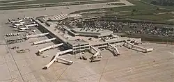 In 1993, Malév launched the airport's first Hungarian overseas flight, to New York-Newark via Rome.[13][14] According to the traffic figures forecast for the millennium, the two terminals serving 4 million passengers a year promised to be insufficient. The construction of Terminal 2B was started in 1997. The new building, with more than 30,000 square metres of space, together with a new apron, was opened in 1998, with all foreign airlines moving there. Terminal 2B can receive 3.5 million passengers a year, with its seven gates and five remote stands.[15]