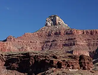 The summit of Buddha Temple is composed of Kaibab Limestone caprock overlaying cream-colored, cliff-forming, Permian Coconino Sandstone.[8] The sandstone, which is the third-youngest of the strata in the Grand Canyon, was deposited 265 million years ago as sand dunes. Below the Coconino Sandstone is slope-forming, Permian Hermit Formation, which in turn overlays the Pennsylvanian-Permian Supai Group. Further down are strata of Mississippian Redwall Limestone, Cambrian Tonto Group, and finally Proterozoic Unkar Group at creek level and Granite Gorge.[9] Precipitation runoff from Buddha Temple drains south into the Colorado River via Bright Angel Creek on its east side, and Phantom Creek on the west side.