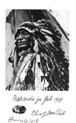 By 1931, Two Guns White Calf, son of the last Blackfoot tribal chief, was capitalizing off his claim to be the model for the coin. To try to put an end to the claim, Fraser wrote that he had used three Indians for the piece, including "Iron Tail, the best Indian head I can remember. The other one was Two Moons, the other I cannot recall."[49] In 1938, Fraser stated that the three Indians had been "Iron Tail, a Sioux; Big Tree, a Kiowa; and Two Moons, a Cheyenne".[49] Despite the sculptor's efforts, he (and the Mint) continued to receive inquiries about the identity of the Indian model until his 1953 death.[50]