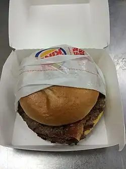 The Angus burger was first introduced into the North American market in 2004.[17] The burger featured a seasoned, 1⁄3 lb (150 g) patty that was intended to have a "steak flavor". The sandwich was introduced at the height of the low-carbohydrate diet craze that was popular in the United States at the time, a trend that Burger King hoped to capitalize on. The chain also hoped to stave off competition from up-and-coming fast casual restaurant chains such as Panera Bread and Chipotle by adding a higher quality product.[18][19] At the time of the introduction, the sandwich's price point was $3.29 – one of the highest-cost sandwiches the chain had introduced to that point.[18] The sandwich was introduced in two varieties, but was supplemented with a two LTO varieties, one of which was a product tie-in with NBC's The Apprentice in 2005.[20][21]