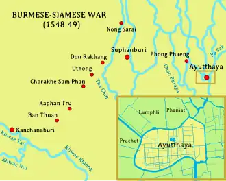 The invasion initially met little resistance, as the Burmese forces were too large for the small guard posts around the border.[20] Upon hearing of the Burmese invasion, Maha Chakkraphat mobilized his kingdom, then gathered his forces at Suphanburi, a town just west of Ayutthaya.[28] When Tabinshwehti and his army arrived at the walled town of Kanchanaburi, they found it completely deserted.[29] About a month into the invasion, mid-November 1548,[note 5] the King of Burma then continued his march eastward, capturing the villages of Ban Thuan, Kaphan Tru, and Chorakhe Sam Phan.[29] The Burmese continued their advance and captured the ancient town of Uthong as well as the villages of Don Rakhang and Nong Sarai and closing in on Suphanburi. When the Burmese attacked the town, Siamese defenders could not withstand the onslaught and retreated towards Ayutthaya. Tabinshwehti ordered his army southeast along two canals, and crossed the Chao Phraya river near Phong Phaeng. From here he encamped his army directly north of the Siamese capital of Ayutthaya on a field called the Lumpli plain.[29]