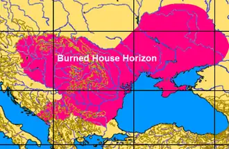 Although the phenomenon of house burning is pervasive throughout the Cucuteni-Trypillian culture's existence, it was by no means the only southeastern European Neolithic society that experienced this.[1] The British-American archaeologist Ruth Tringham has coined the term Burned House Horizon to describe the extent of the geographical region that indicates this repetitive practice of house burning in southeast Europe. She, along with Serbian archaeologist Mirjana Stevanović, mapped out this phenomenon from archaeological sites throughout the entire region, and came to the conclusion that: