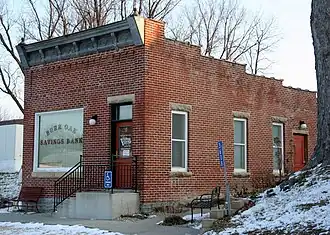 Burr Oak Savings Bank – also known as the Burr Oak Post Office – is an historic building located in Burr Oak, Iowa, United States. The free-standing, single-story, brick structure was built in 1910 in the Italianate style.[2] Its primary decorative feature is a panel with corbeled brickwork in a dentil-like pattern, and the bracketed tin cornice above it.[3] In 1931 it suffered a robbery, being the first robbery in Winneshiek County.[4] That same year – as well as in 1941, 1955 and 1967 – the building underwent expansions. [5] After the bank closed, the building was used as a barber shop[6] and the post office, which closed in 1981. In 2014 it became the Visitors Center for the Laura Ingalls Wilder Museum and Park.[7] It is the only building that remains on Burr Oak's main street from a period of economic expansion in early 20th-century Iowa, based on agricultural production and land values.[8] It was listed on the National Register of Historic Places in 2001.[1]