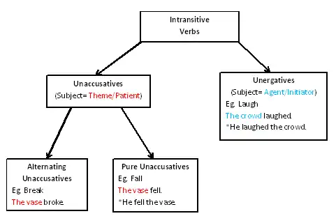 The following flow chart depicts the difference between the two types of intransitive verbs; unaccusative and unergative. Unaccusative verbs are subdivided into "pure unaccusatives" and alternating unaccusatives (unaccusatives that are able to undergo causative alternation such as labile verbs). For more information on alternating unaccusatives, see causative alternation.