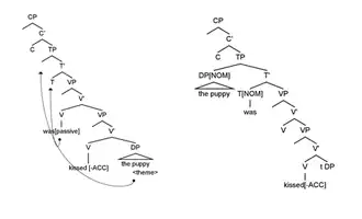 Burzio's Generalization builds off of the cross linguistic similarities observed in passives and unaccusatives, where a verb fails to assign a theta role to the subject and cannot assign accusative Case to the object. These structures all undergo similar DP movement as a way to satisfy Extended Projection Principle and Case Theory. Extended Projection Principle states that all clauses must contain a DP subject and Case Theory states that all DP's must check for Case in the complement or specifier position. A theta role is not assigned to the subject position because the subject is underlyingly in the object position during theta role assignment (which happens in the d-structure). Therefore, it has a theta role that is typically given to objects, such as "theme." Verbs in these structures cannot assign accusative Case, therefore the DP must move to the empty specifier position of finite Tense (T) in order to fulfill the subject position and check for Case. Once the DP has moved to the specifier position of Tense Phrase (TP), nominative case is assigned to the DP by the T position. This occurs in the s-structure after the DP has moved from the object position.[14]