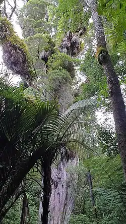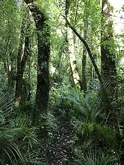 The reserve is a remnant of temperate lowland forest and is surrounded by pasture land.[32] The upper canopy in the reserve consists of trees such as northern rātā, mataī, miro, kahikatea, tōtara, rimu, hīnau, tawa, and pukatea. The large number of pukatea is a particular feature of the reserve. The canopy trees support a wide range of ephiphytes including astelia, ferns and orchids, along with climbing plants such as rātā, clematis, New Zealand passionfruit and supplejack. The sub-canopy of the forest includes nīkau palms and tree ferns such as mamaku, along with tarata, kohukohu, tīkoki and rewarewa.[33][34]