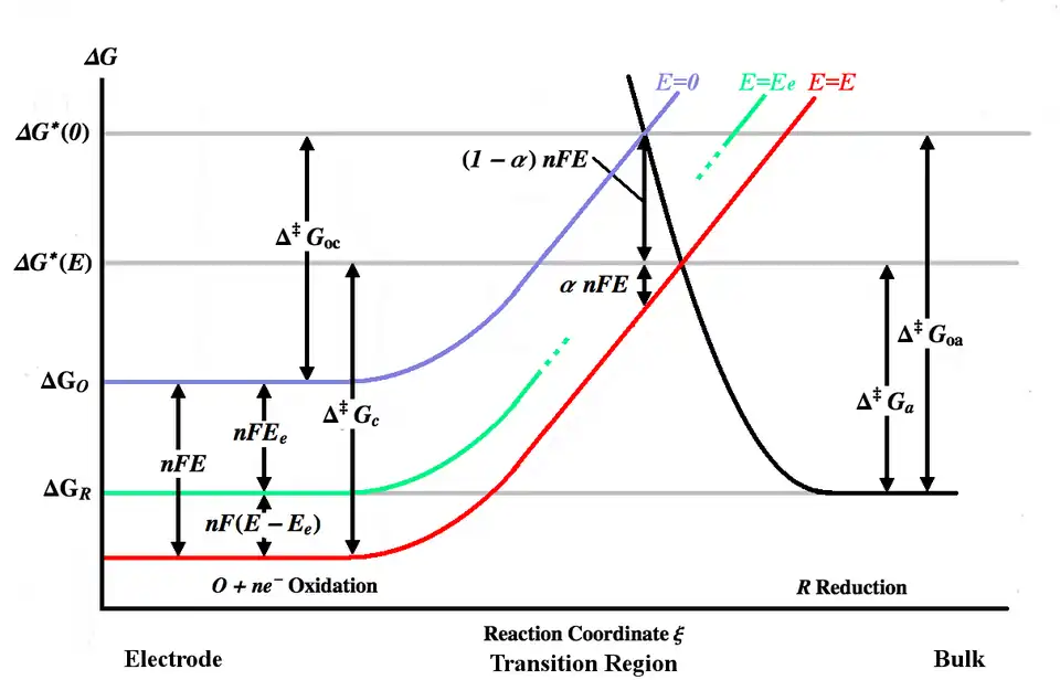 The figure above plots various Gibbs energy curves as a function of the reaction coordinate ξ. The reaction coordinate is roughly a measure of distance, with the body of the electrode being on the left, the bulk solution being on the right. The blue energy curve shows the increase in Gibbs energy for an oxidized molecule as it moves closer to the surface of the electrode when no potential is applied. The black energy curve shows the increase in Gibbs energy as a reduced molecule moves closer to the electrode. The two energy curves intersect at . Applying a potential E to the electrode will move the energy curve downward[Note 3] (to the red curve) by nFE and the intersection point will move to . and are the activation energies (energy barriers) to be overcome by the oxidized and reduced species respectively for a general E, while and are the activation energies for E=0. [Note 4]