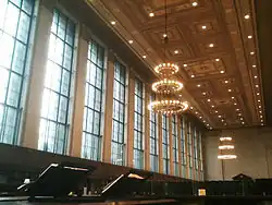 The large mural in the entrance lobby, titled Videbimus Lumen, (based on the university's motto In Lumine Tuo Videbimus Lumen, or In Thy Light Shall We See Light) was painted in 1934 by Eugene Francis Savage. The composition is anchored by the figure of Athena, echoing the large Alma Mater sculpture in front of Low Library in the center of the campus. The mural contains references to light, social struggle, fascism, and the architecture of Columbia and New York City.[17]