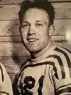When North Dakota was preparing to bring back its ice hockey program after World War II, brothers Buzz and Prince Johnson were playing amateur hockey for the Grand Forks Amerks and came to the attention of Cal Marvin, who was leading the effort to rekindle the team.[3] Both players began attending the University of North Dakota and made their debuts in the 1947–48 season. The team played well with Johnson on the team, posting their first double-digit win season. The team flagged the following year because Johnson had played well enough to be included on the US national team for the 1949 Ice Hockey World Championships.[4] While missing the entire season for North Dakota, Johnson was nearly a point-per-game player over eight games as the US won the bronze medal. He did, however, have an even greater impact after the championship was over; Zdeněk Marek, a member of the gold-medal-winning Czech team, had decided to hide in Stockholm rather than return to Czechoslovakia because he was not a member of the Communist Party. During his time playing for the team he had confided his trepidation at returning home to Johnson and his brother. The two promised to assist Marek in earning a student visa so he could defect to the United States. The plan came to fruition when North Dakota offered Marek a scholarship on July 12, 1949.[5] Marek was eventually granted permanent resident status by an act of congress and lived in the United States until his death in 2019.[6]
